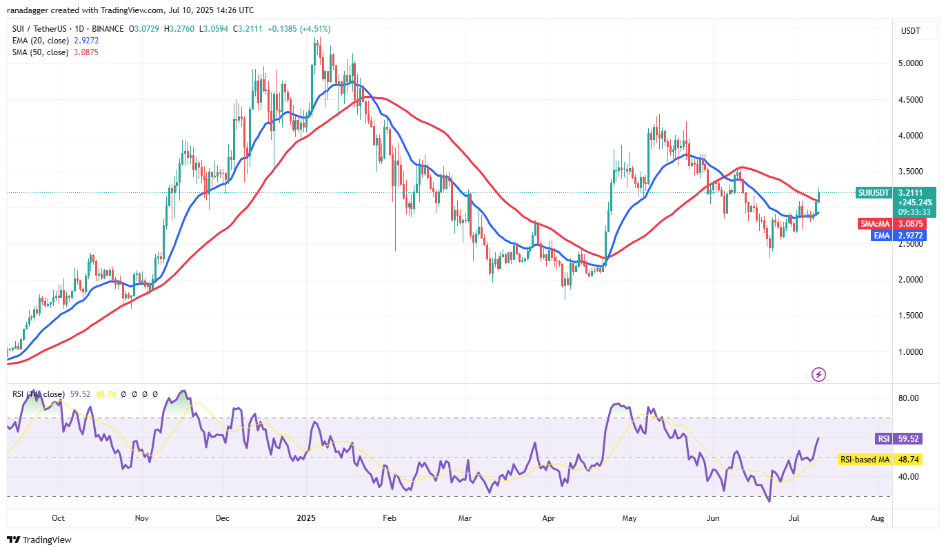 The 20-day EMA is trying to turn up, and the relative strength index (RSI) has jumped into positive territory, indicating that the bulls are back in the game. If buyers maintain the price above the 50-day SMA, the SUI/USDT pair could climb to $3.55.