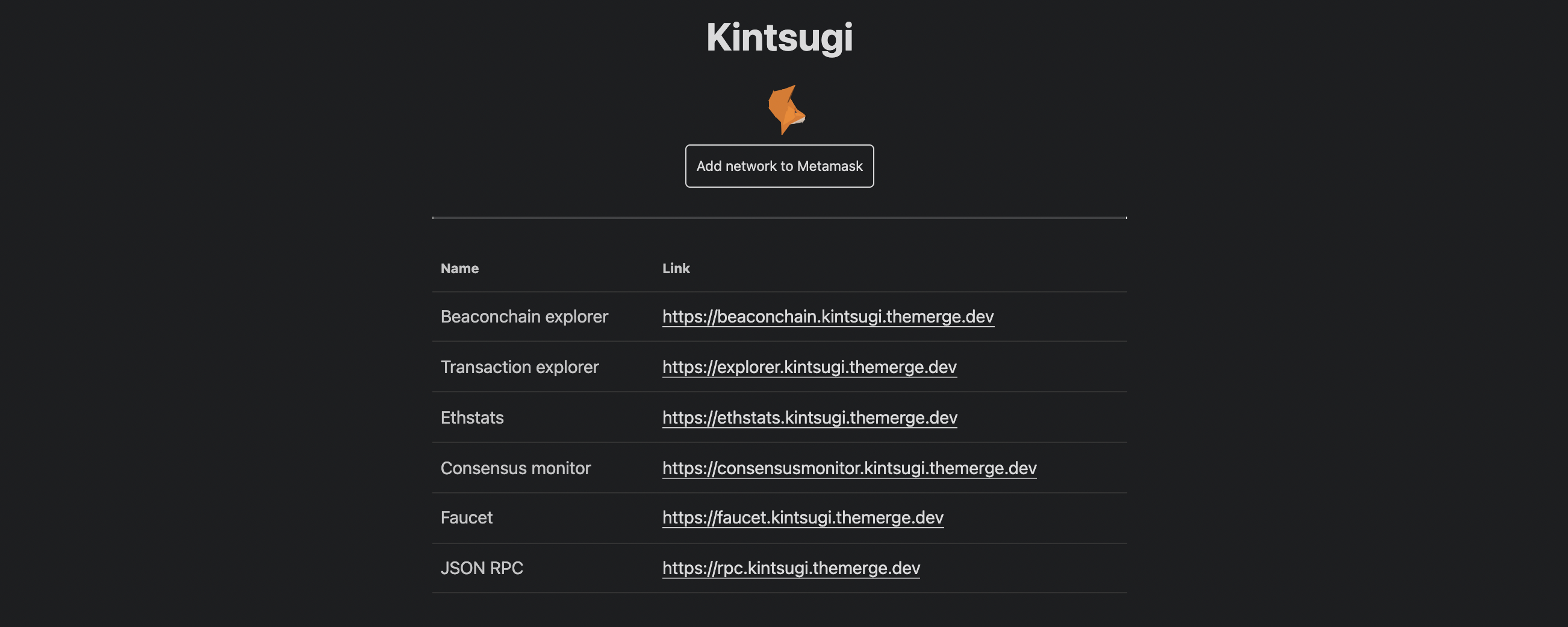 Check out the Kintsugi landing page for information about interacting with the Kintsugi network. You’ll find network settings, a faucet, a block explorer and a JSON-RPC endpoint, along with documentation updated to reflect supported consensus execution layer client combinations.