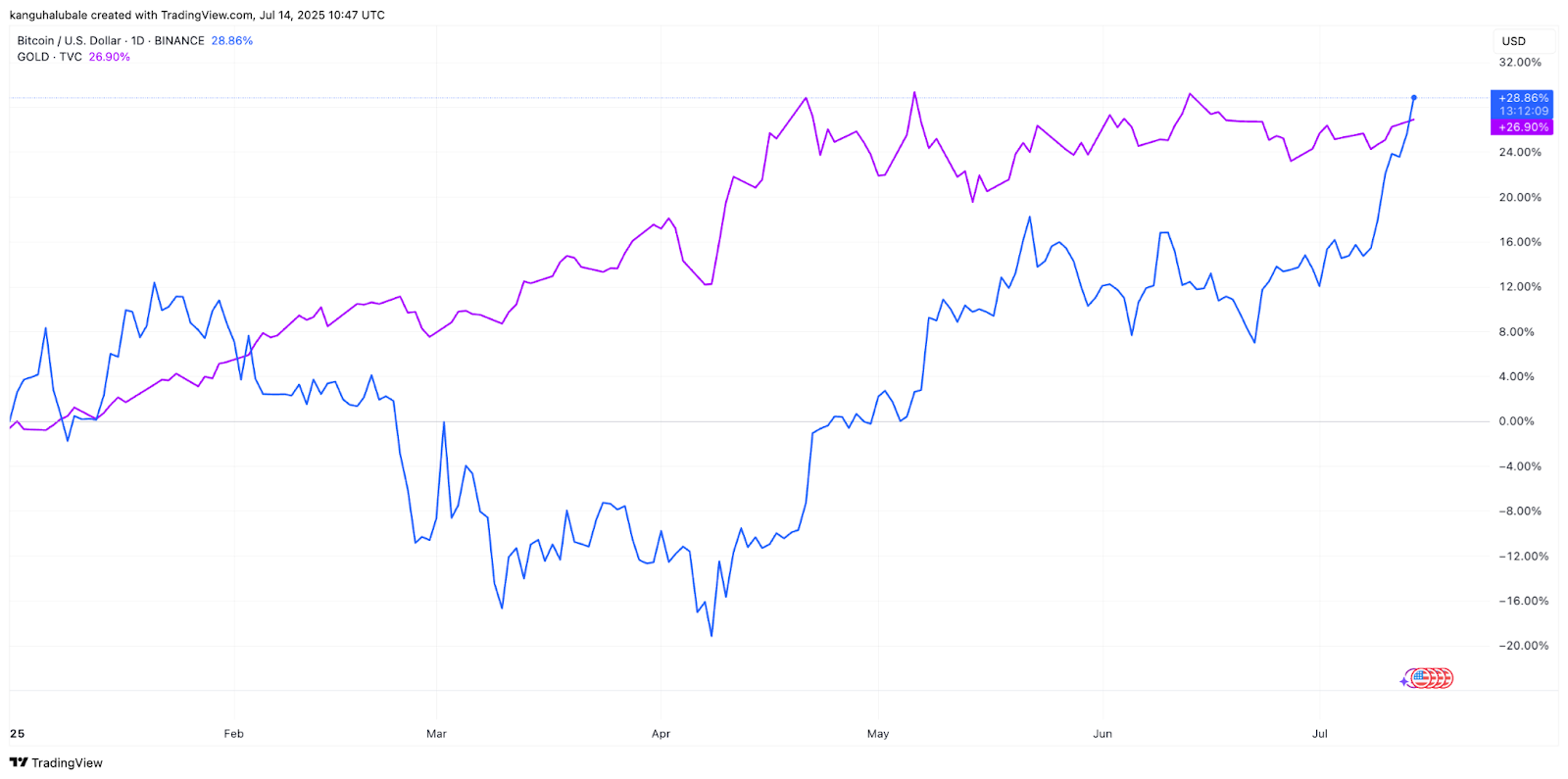 Bitcoin’s new highs above $122,000 translate to 29% year-to-date gains, overtaking gold’s 27%.