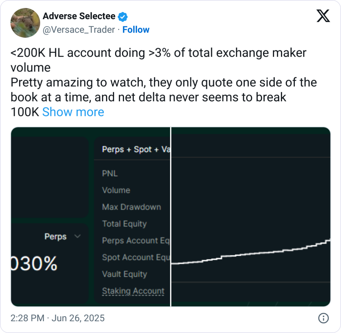 Market observer Adverse Selectee highlighted a small trading account holding less than $200,000 in equity on Thursday. Over the past two weeks, the account recorded a trading volume of $1.4 billion and has consistently ranked among the top contributors to the exchange’s total maker volume.