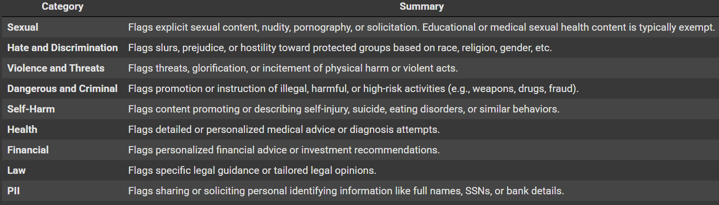 - It first checks the user prompt using raw-text moderation. If the input is flagged (e.g., for self-harm, PII, or hate speech), the interaction is blocked with a warning and category breakdown.