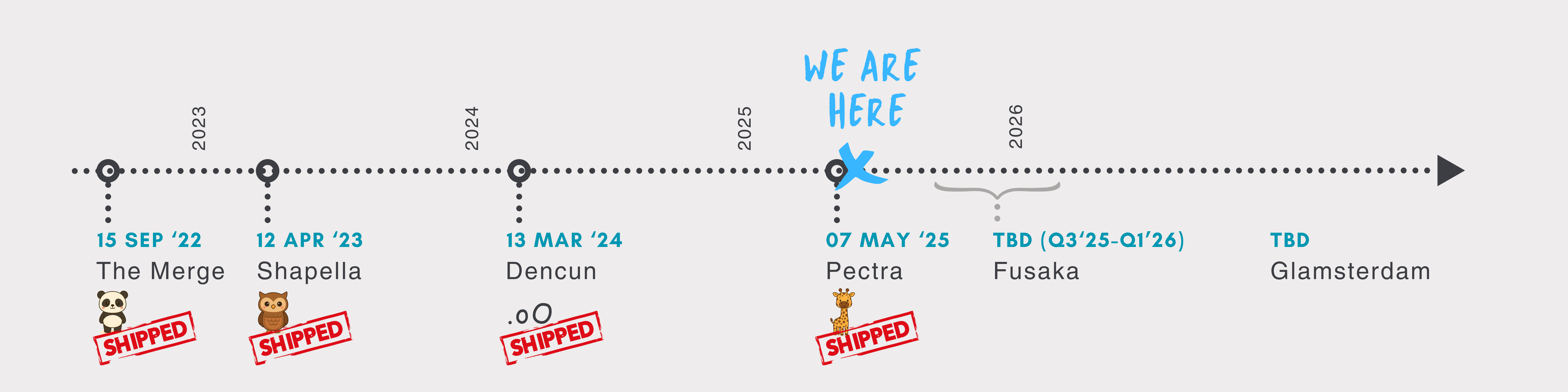 Since the last Checkpoint, the Pectra upgrade shipped and core developers have maintained a heavy emphasis on keeping the next upgrade (Fusaka) lean to get PeerDAS, a scaling unlock, out the door. Fusaka testing is ongoing and developers are still optimistic about a 2025 release date. Proposals for the headlining feature of the upgrade following Fusaka (”Glamsterdam”, ~2026) are being solicited until June 20th.