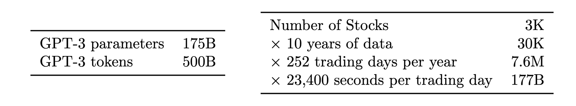 Where things break down is in the quantity and information content of available data to train the models. At the 2023 NeurIPS conference, Hudson River Trading, a high frequency trading firm, presented a comparison of the number of input tokens used to train GPT-3 with the amount of trainable tokens available in the stock market data per year HRT estimated that, with 3,000 tradable stocks, 10 data points per stock per day, 252 trading days per year, and 23400 seconds in a trading day, there are 177 billion stock market tokens per year available as market data. GPT-3 was trained on 500 billion tokens, so not far off [6].