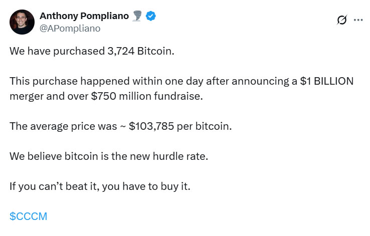 “We believe Bitcoin is the new hurdle rate. If you can’t beat it, you have to buy it,” Pompliano said on X.
