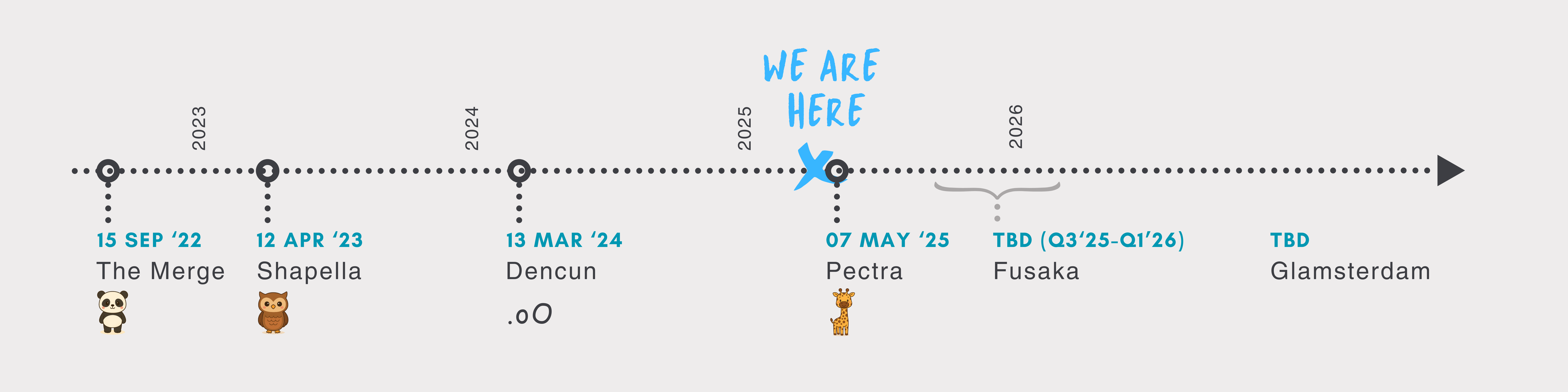 The past month centered on locking in the scope of the Fusaka upgrade and final Pectra deployment details. The Pectra upgrade ships on mainnet in just about a week, after which focus will shift to Fusaka testing and deciding what goes into the Glamsterdam upgrade (in other words, the ”scope” of the upgrade). A new All Core Developer (”ACD”) call structure will split testing and scoping into separate calls to parallelize and accelerate shipping upgrades.