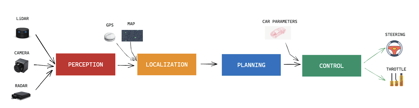 Self-driving cars may be following a similar event. Back in the 2010s, most of them were built using what we call a « modular » approach. The software « autonomous » part is split into several modules, such as Perception (the task of seeing the world), or Localization (the task of accurately localize yourself in the world), or Planning (the task of creating a trajectory for the car to follow, and implementing the « brain » of the car). Finally, all these go to the last module: Control, that generates commands such as « steer 20° right », etc… So this was the well-known approach.