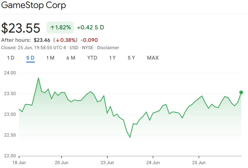 In the Monday trading session after its filing, Google Finance data shows GameStop shares (GME) dropped from an opening price of $23.03 down to a low of $22.45, representing a 2.5% drop.