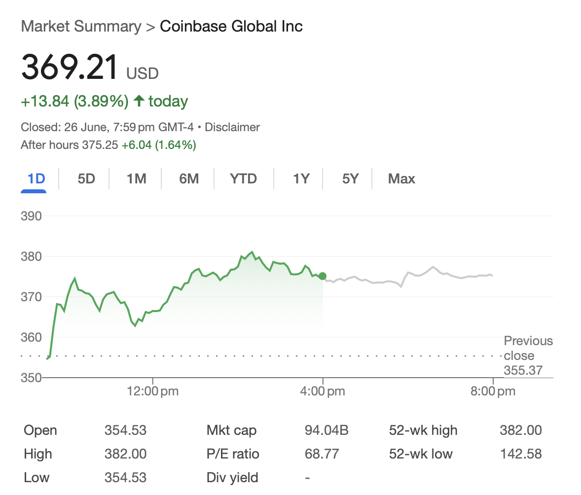 The Nasdaq-listed Coinbase closed trading on Thursday at $369.21, up 3.89% over the day and up almost 40% on the month, according to Google Finance.