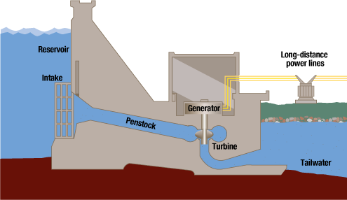 Simple diagram illustrating how hydroelectric power is generated (Tennessee Valley Authority)