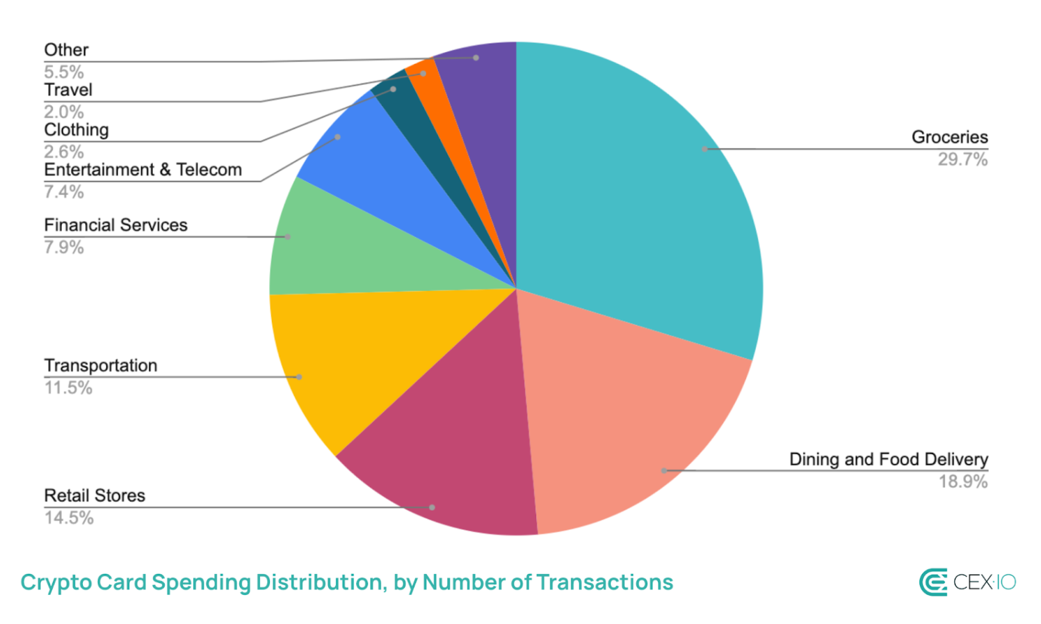 Spending patterns show crypto cardholders are using their cards for everyday spending. According to CEX.IO data, groceries make up 59% of purchases, near the ECB’s 54% benchmark, while dining and bars account for 19%, above the average for in-person food and drink spending.