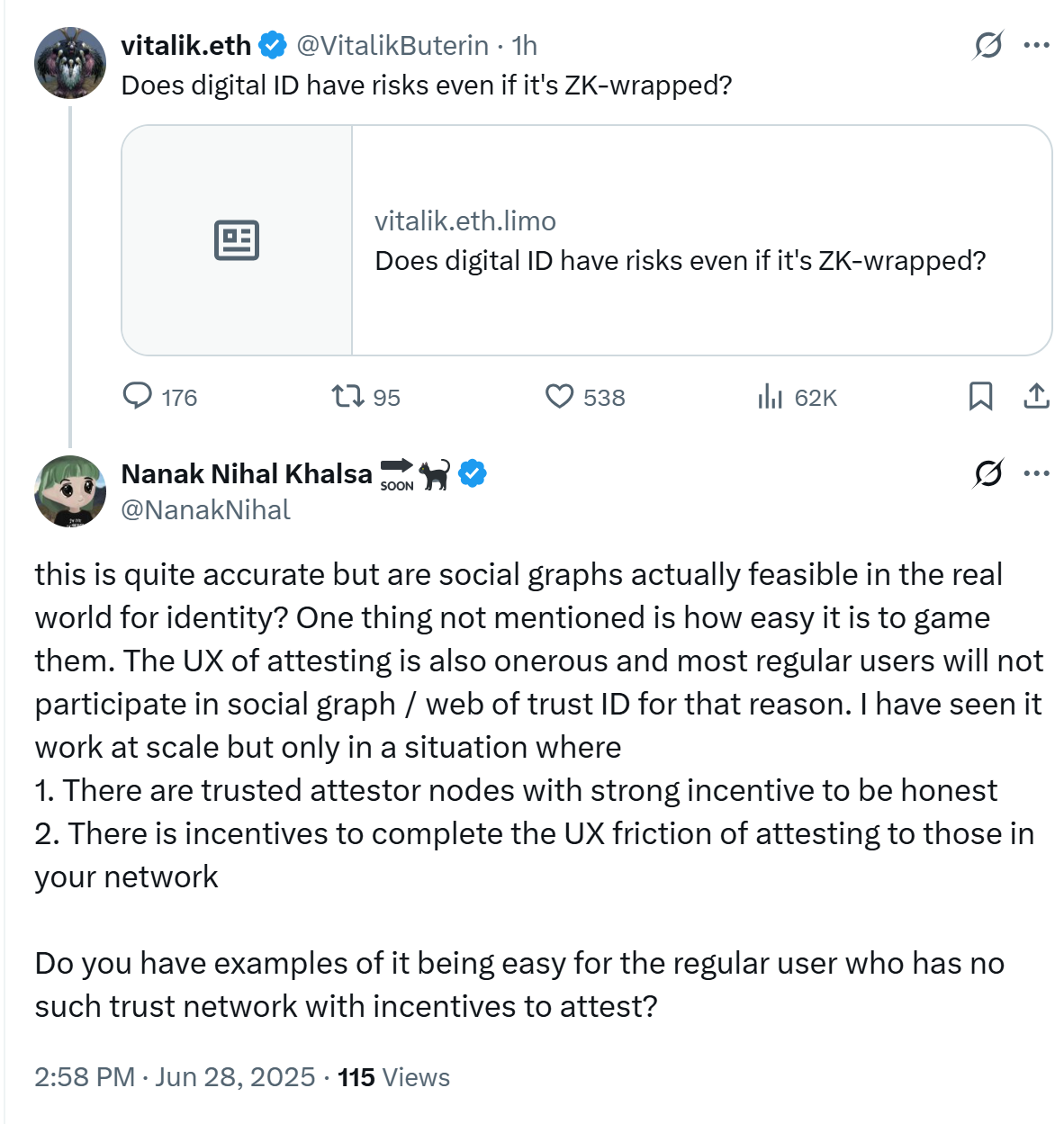 He explained these could be explicit, using social-graph-based verification like Circles, or implicit, relying on multiple ID providers — government documents, social platforms, and others — so no one ID gains near-total market share.