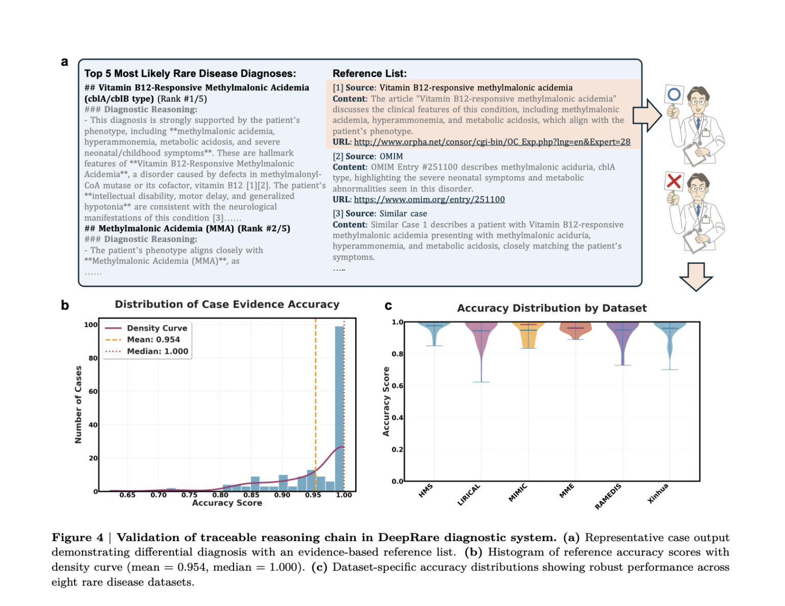 Extensive clinician evaluations of DeepRare involving 50 complex cases affirmed its diagnostic reasoning, achieving a 95.2% expert agreement rate on clinical validity and traceability. Physicians recognized its efficiency in producing accurate and clinically relevant references, significantly reducing diagnostic uncertainty. For practical clinical integration, DeepRare is accessible via a user-friendly web application that enables the structured input of patient data, genetic sequencing files, and imaging reports.