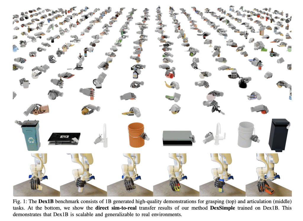 Researchers at UC San Diego have developed Dex1B, a massive dataset of one billion high-quality, diverse demonstrations for dexterous hand tasks like grasping and articulation. They combined optimization techniques with generative models, using geometric constraints for feasibility and conditioning strategies to boost diversity. Starting with a small, carefully curated dataset, they trained a generative model to scale up efficiently. A debiasing mechanism further enhanced diversity. Compared to previous datasets, such as DexGraspNet, Dex1B offers vastly more data. They also introduced DexSimple, a strong new baseline that leverages this scale to outperform past methods by 22% on grasping tasks.