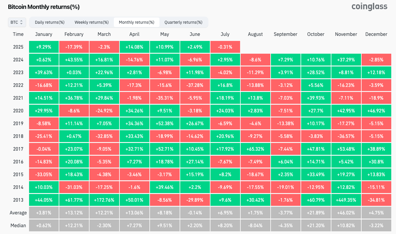 For BTC/USD, the picture is rather more mixed. Data from monitoring resource CoinGlass shows that May and June have witnessed wide variations in price performance, while July has fared better, with maximum losses under 10%.