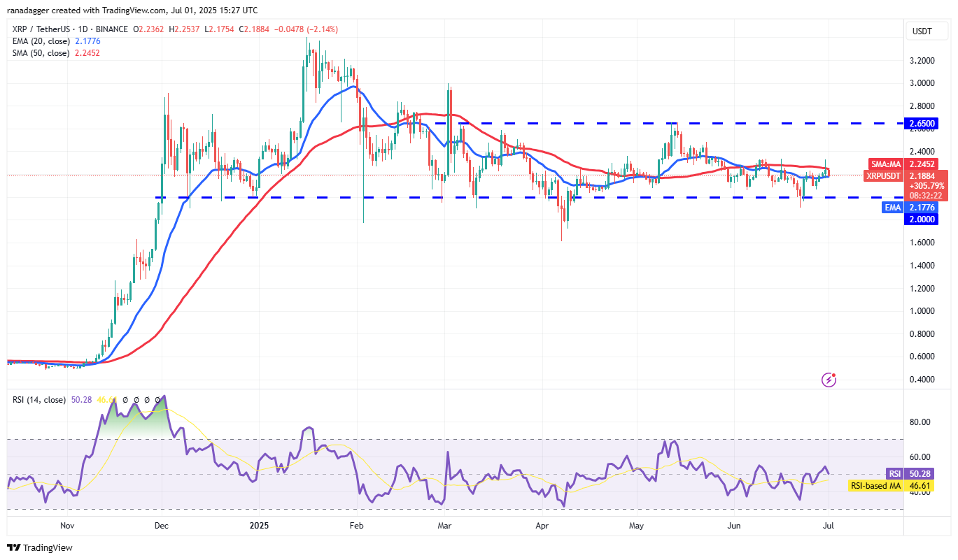 The 20-day exponential moving average ($2.17) is the key level to watch out for in the near term. If the price rebounds off the 20-day EMA with force, it increases the likelihood of a break above the $2.35 resistance. If that happens, the XRP/USDT pair may surge to $2.65.
