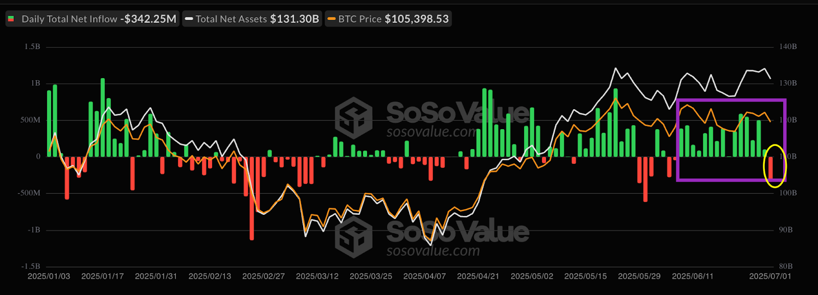 However, investors stopped the inflows by withdrawing $342.2 million on July 1 as the Bitcoin price hovered around $106,000.