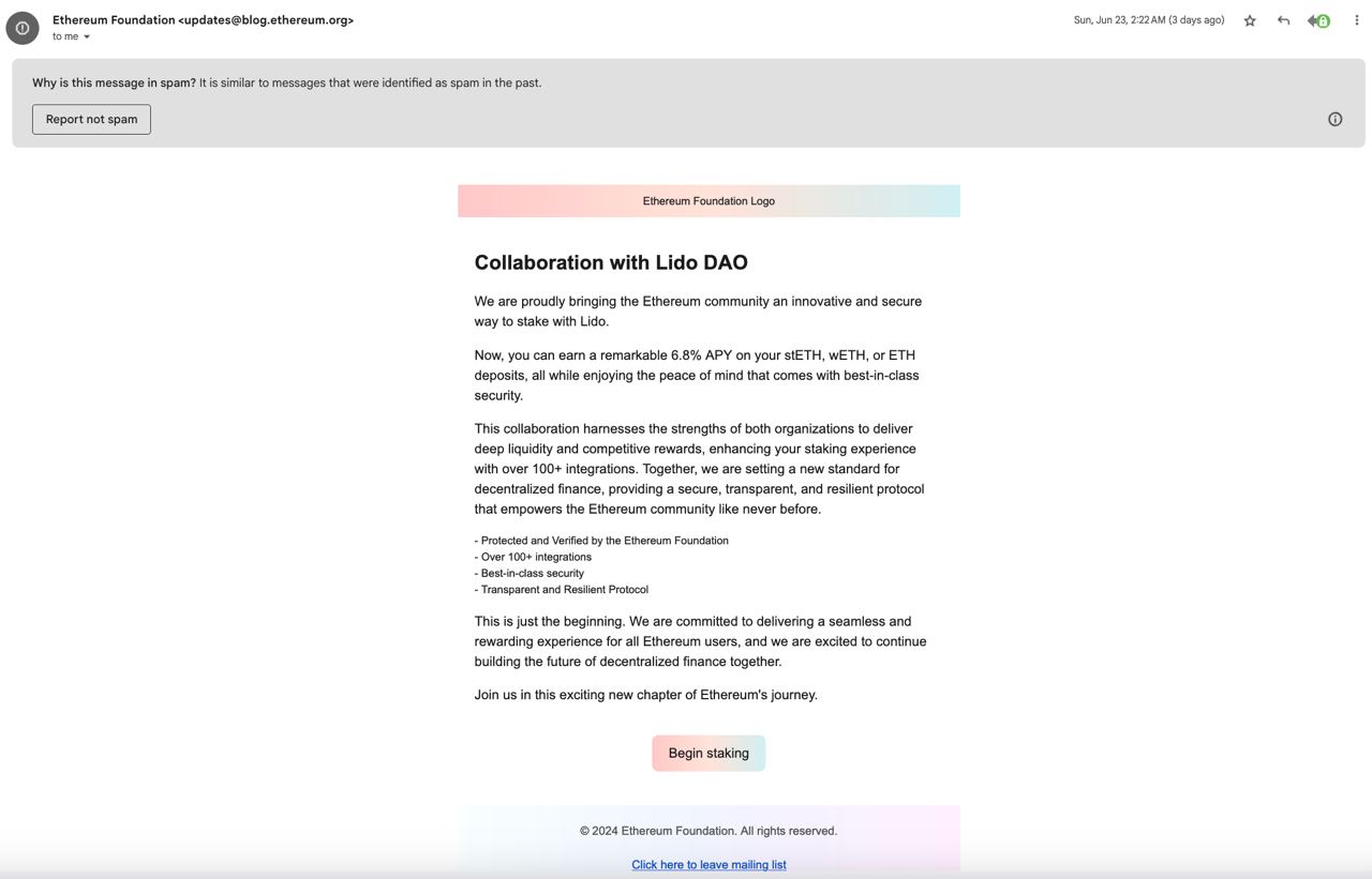 - Analyzing on-chain transactions made to the threat actor between the time they sent out the email campaign and the time the malicious domain got blocked, appear to show that no victims lost funds during this specific campaign sent by the threat actor.