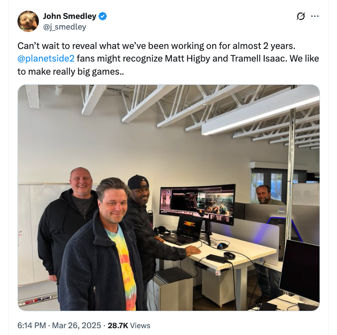 Smedley teased the new game in an X post in March, showing a photo next to Planetside 2 creative director Matt Higby and Fallout artist Tramell Ray Isaac.