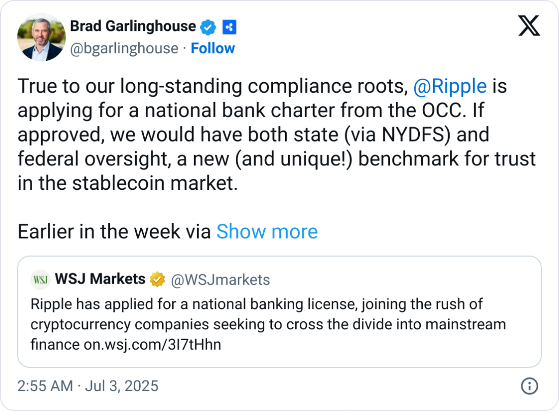 Ripple CEO Brad Garlinghouse wrote to X on Wednesday that the company is applying for a license with the US national bank regulator, the Office of the Comptroller of the Currency (OCC), confirming an earlier report from The Wall Street Journal.