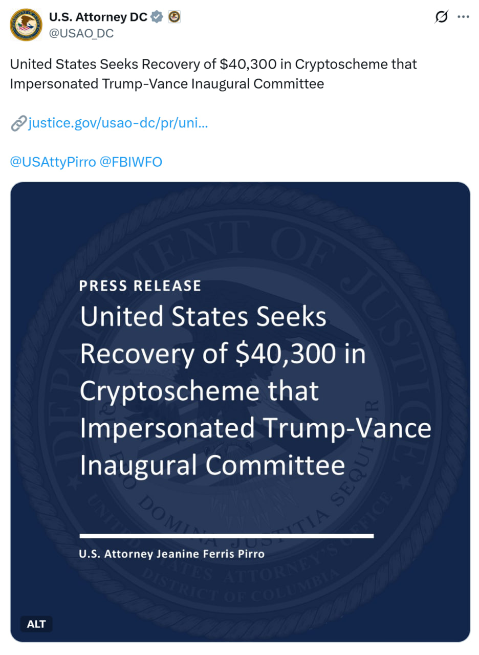 US federal prosecutors seized $40,300 in cryptocurrency recovered from an email scam that impersonated the Trump-Vance Inaugural Committee, according to a complaint filed by US Attorney Jeanine Ferris Pirro.