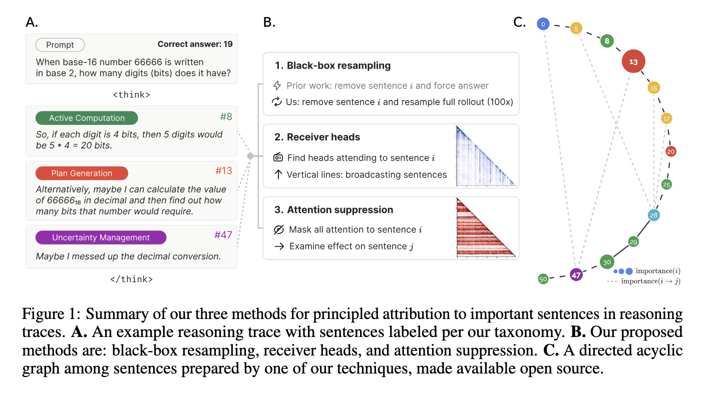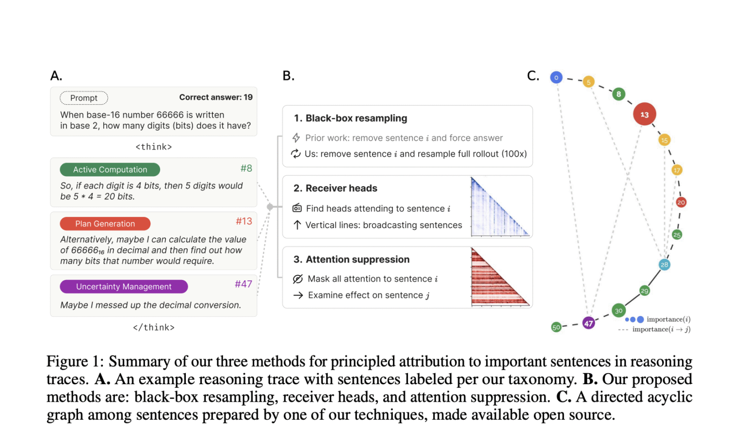 Researchers from Duke University and Aiphabet introduced a novel interpretability framework called “Thought Anchors.” This methodology specifically investigates sentence-level reasoning contributions within large language models. To facilitate widespread use, the researchers also developed an accessible, detailed open-source interface at thought-anchors.com, supporting visualization and comparative analysis of internal model reasoning. The framework comprises three primary interpretability components: black-box measurement, white-box method with receiver head analysis, and causal attribution. These approaches uniquely target different aspects of reasoning, providing comprehensive coverage of model interpretability. Thought Anchors explicitly measure how each reasoning step affects model responses, thus delineating meaningful reasoning flows throughout the internal processes of an LLM.