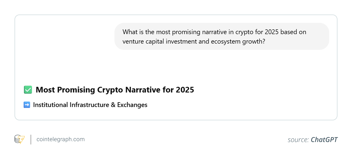 As shown in the image below, according to ChatGPT, “Institutional Infrastructure & Exchanges” is the most important crypto narrative for 2025. This leads due to massive VC backing, like Binance’s $2 billion raise, and growing institutional demand for secure, compliant trading infrastructure.