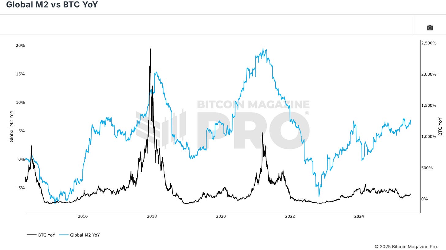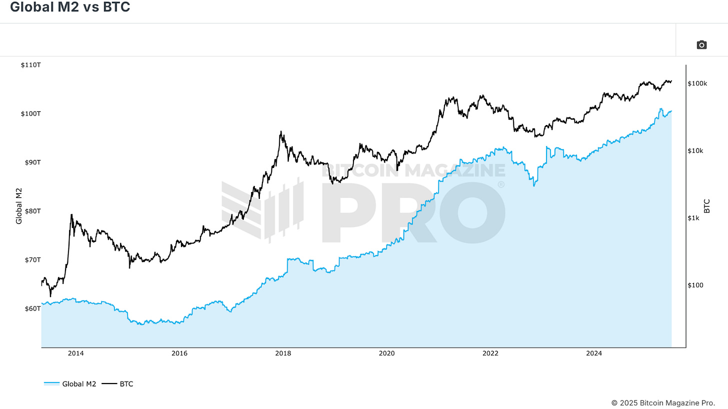 Let’s begin with the Global M2 vs BTC chart. This has been one of the most shared and analyzed charts on Bitcoin Magazine Pro throughout the current bull cycle, and for good reason. The M2 supply encompasses all physical currency and near-money assets in an economy. When aggregated globally across major economies, it paints a clear picture of fiscal stimulus and central bank behavior.
