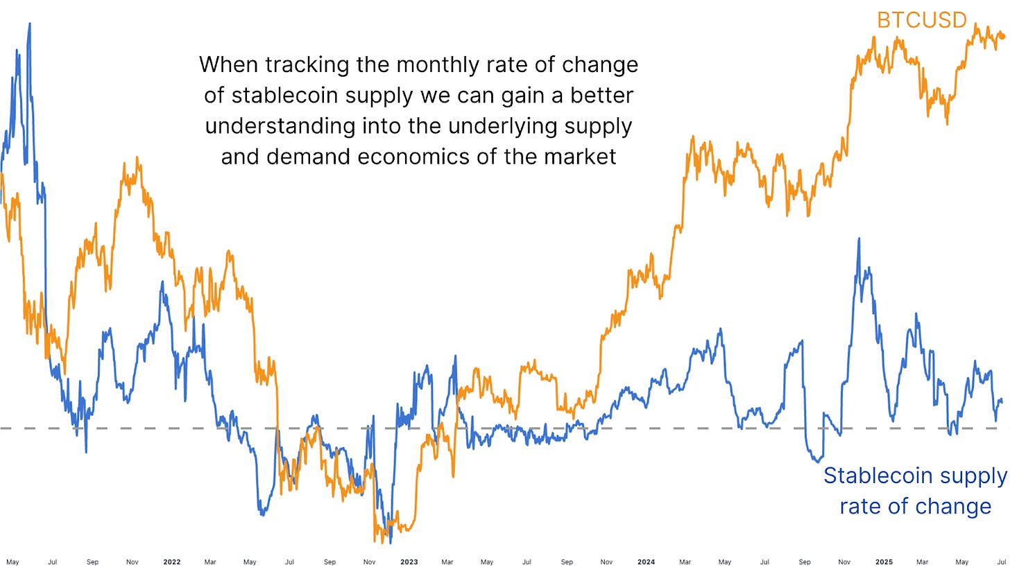 Now, just tracking the raw value of stablecoin supply offers some value, but to truly gain an edge, we examine the rate of change, particularly over a 28-day (monthly) rolling basis. This change in supply is highly indicative of short-term liquidity trends. When the rate turns positive, it often marks the beginning of new BTC accumulation phases. When it turns sharply negative, it aligns with local tops and retracements.