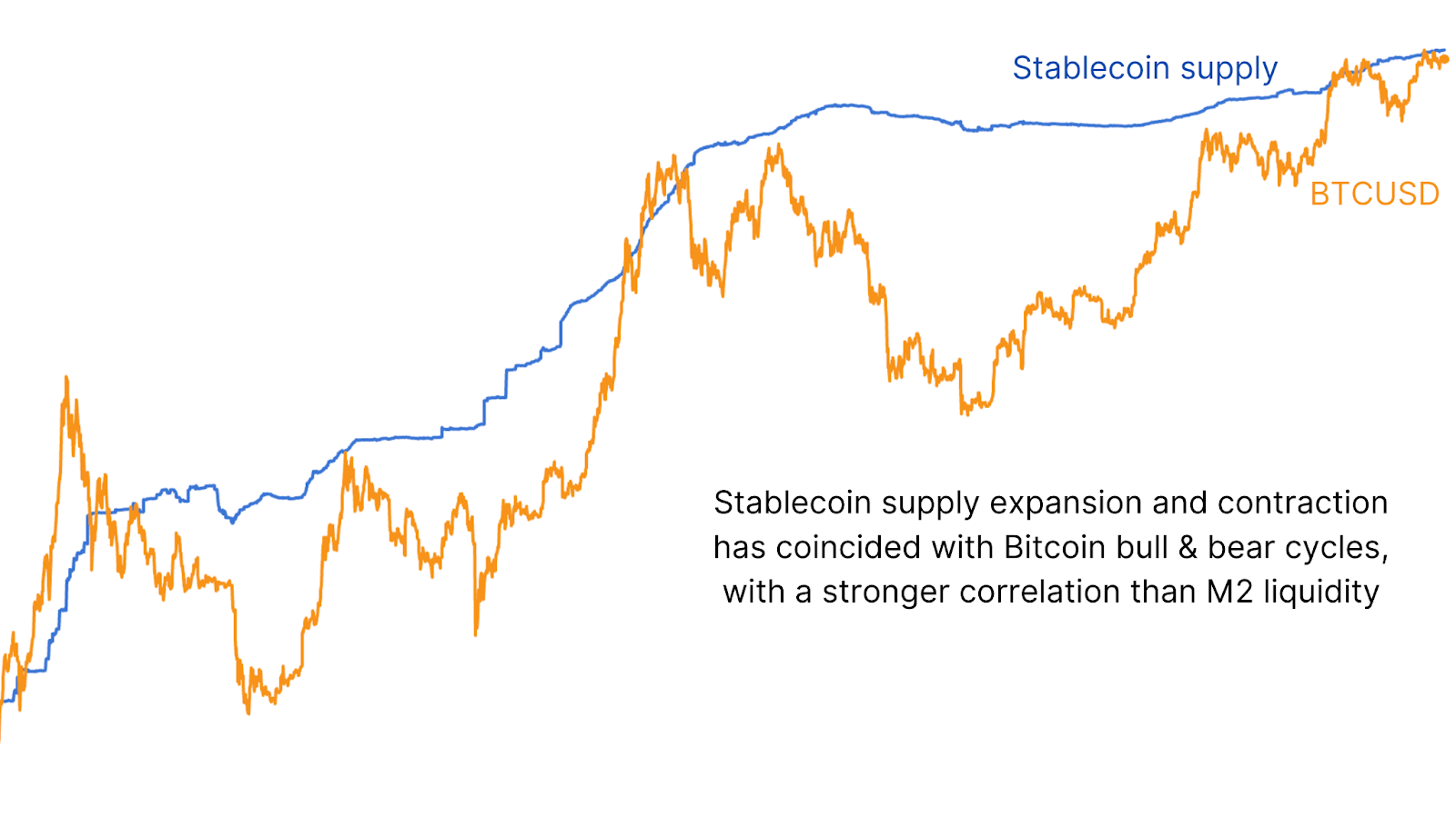 To address this latency, we pivot to a more timely and crypto-native metric: stablecoin liquidity. Comparing BTC to the supply of major stablecoins (USDT, USDC, DAI, etc.) reveals an even stronger correlation than with M2.