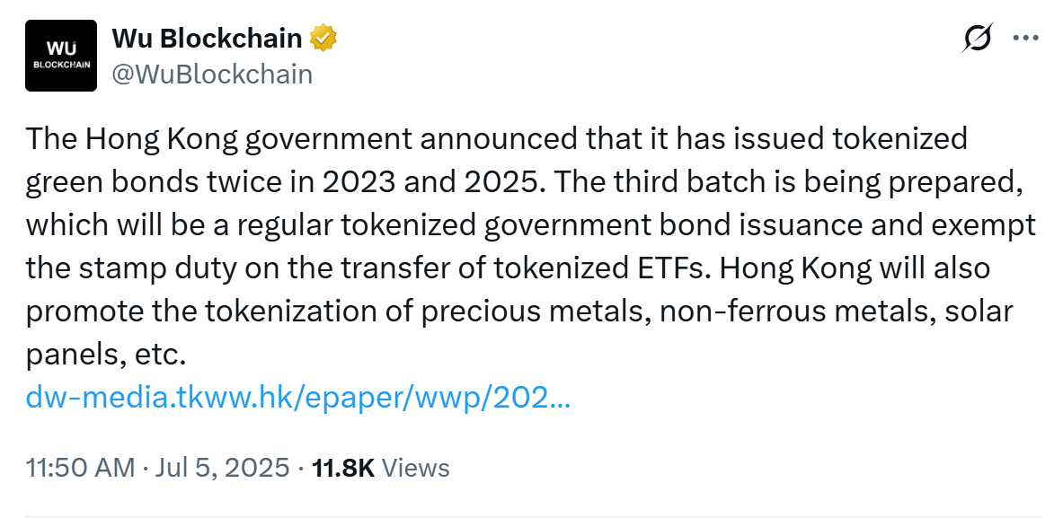 Hui said authorities aim to normalize tokenized government bonds in the future. To encourage wider adoption, the government is considering tax incentives, including exemptions on stamp duty for transfers of tokenized exchange-traded funds.