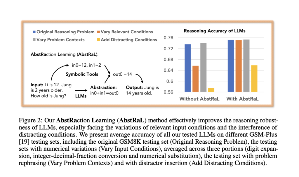 In conclusion, AbstRaL is a method designed to enhance abstract reasoning in LLMs, making them more resilient to superficial changes in problems. Unlike traditional fine-tuning or data augmentation, AbstRaL uses reinforcement learning to train models on GranulAR rationales that mix Socratic chain-of-thought with detailed abstraction. This approach helps models strip away surface-level distractions and better connect with symbolic tools. Tested on challenging GSM8K perturbation benchmarks, AbstRaL notably reduces performance drops under distribution shifts, particularly in smaller models. The study shows that learning to abstract improves reasoning robustness more effectively than relying solely on direct supervision.