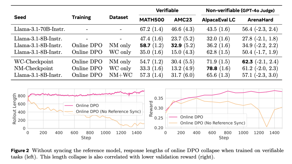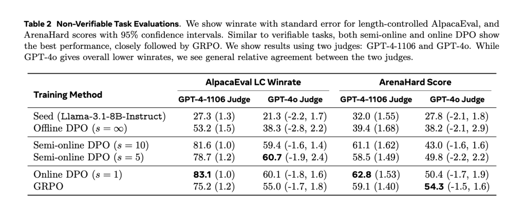 The performance differences were observed. On Math500, the offline DPO reached 53.7% accuracy, whereas the semi-online DPO with a synchronization interval of s = 100 achieved 58.9%. Online DPO and GRPO showed similar results at 58.7% and 58.1%, respectively. Similar trends were observed on the NuminaMath benchmark, where the offline DPO achieved 36.4%, and semi-online variants increased this to 39.4% (s = 10). The performance gains were not limited to math tasks. When non-verifiable tasks were evaluated with AlpacaEval 2.0 and Arena-Hard benchmarks, models trained with mixed reward types performed consistently better. Combining verifiable and non-verifiable rewards in a single training setup resulted in stronger average scores, indicating that the method generalized effectively.