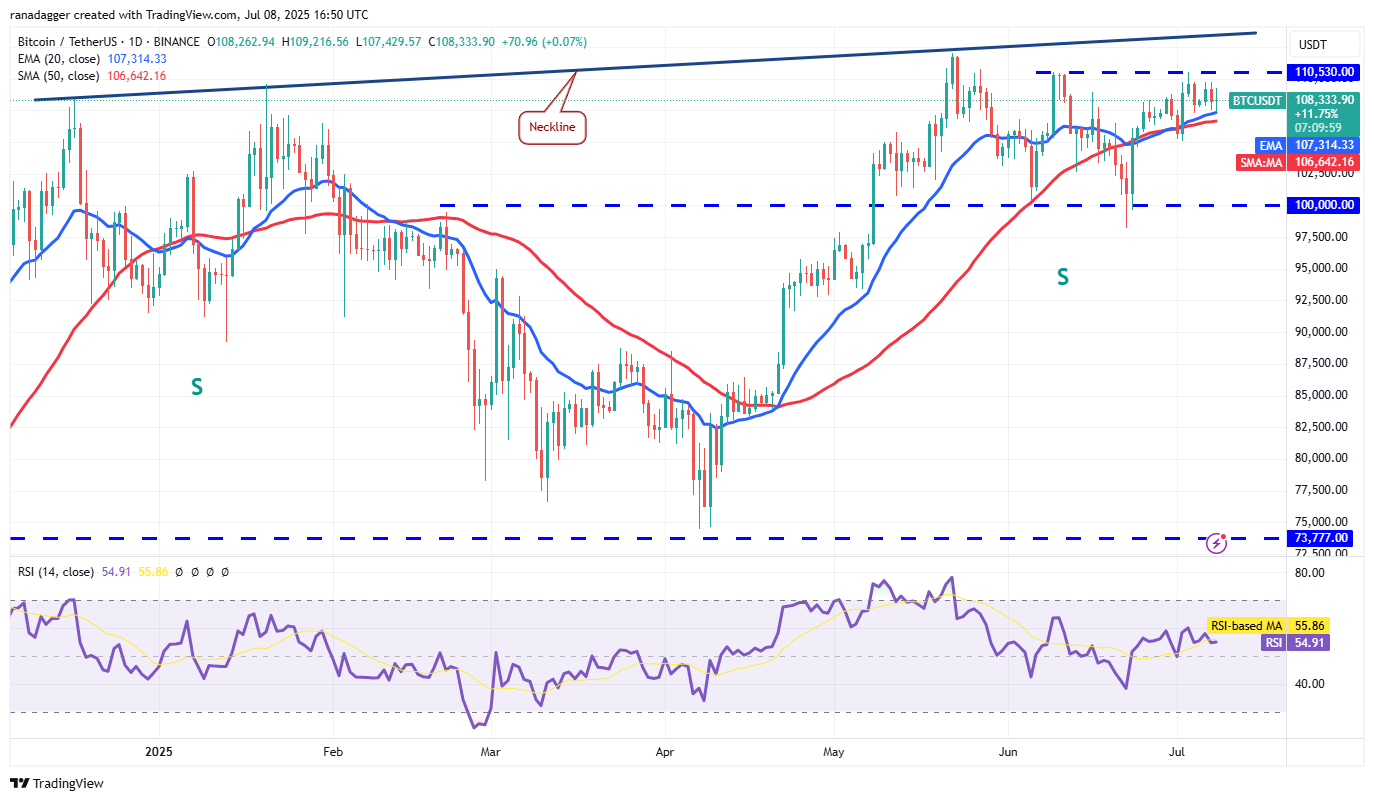 Bitcoin is being squeezed between the 20-day exponential moving average ($107,314) and the overhead resistance of $110,530.