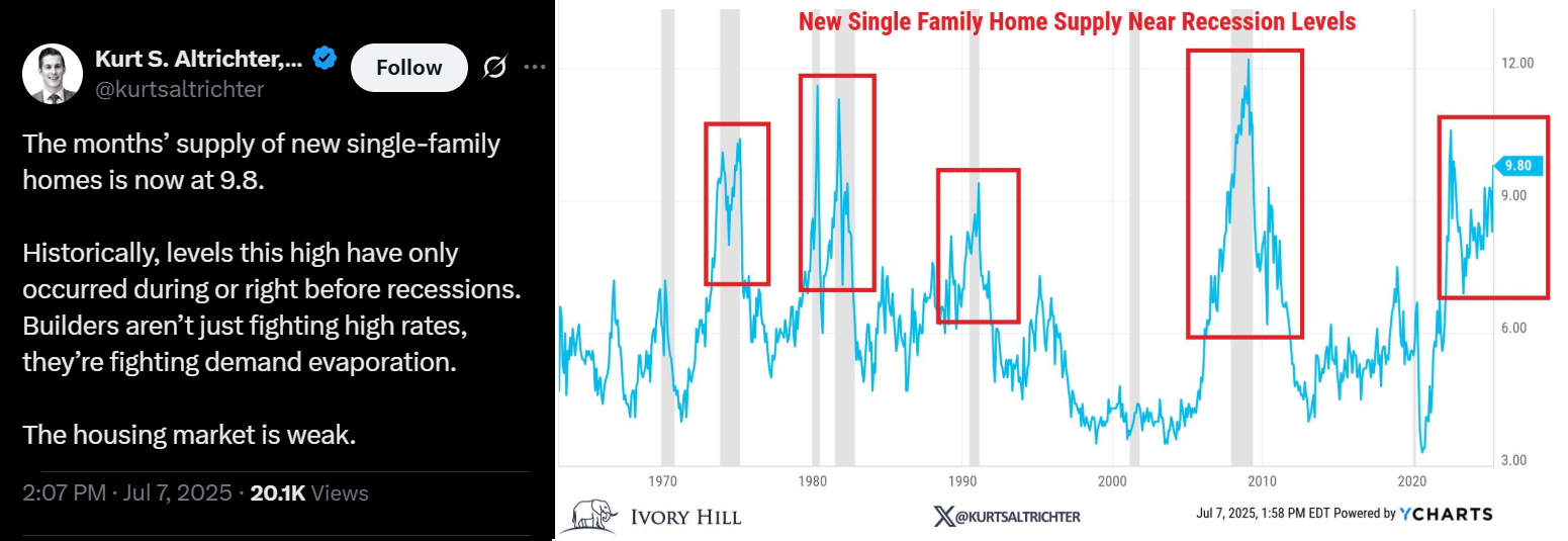 The inventory of new single-family homes is approaching 10 months’ worth of supply. According to Altrichter, this “has only occurred during or right before recessions.” He asserts that the weakness in housing stems from high interest rates but, more importantly, from what he calls “demand evaporation.”