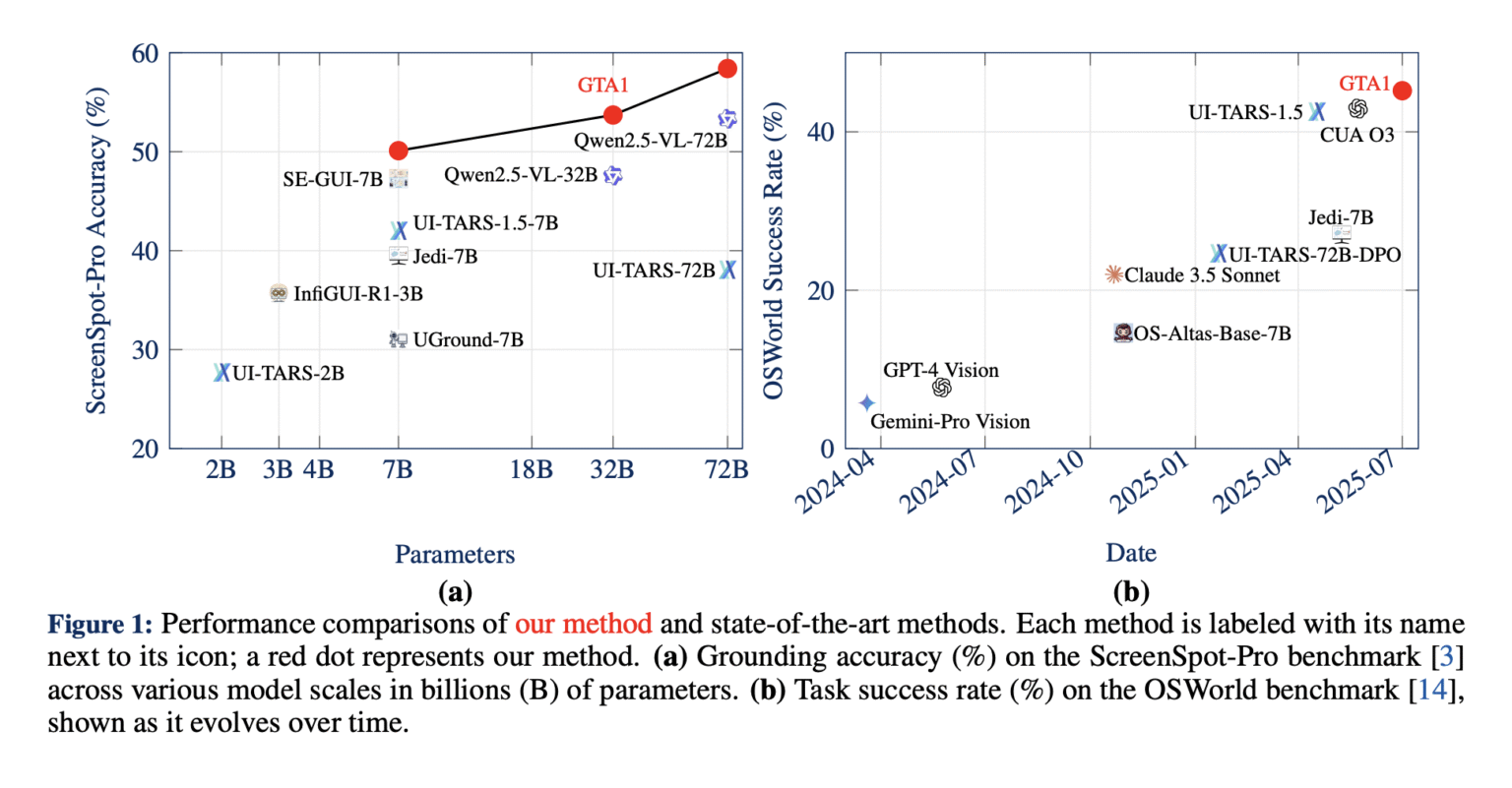 - OSWorld (Task Success Rate): GTA1-7B reaches 45.2%, outperforming OpenAI CUA (42.9%) and Claude 3.7 (28.0%).