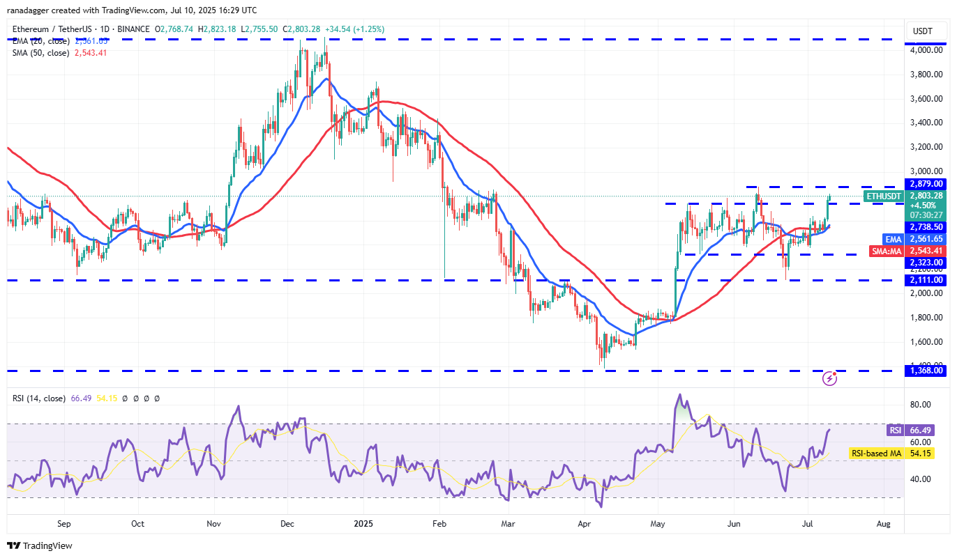 Sellers are likely to have other plans. They will try to pull the price back below $2,738. If they do that, the pair could drop to the 20-day EMA, which is a crucial level to watch out for. If the price rebounds off the 20-day EMA, the bulls will again attempt to drive the price above $2,879.