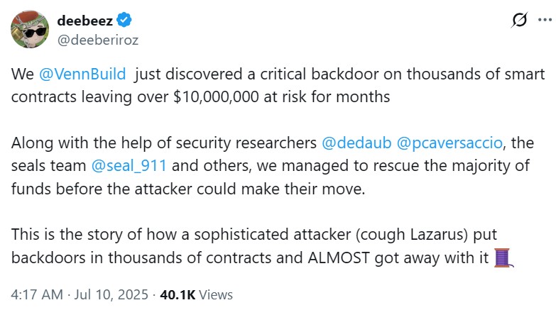 On Thursday, pseudonymous Venn Network researcher Deeberiroz shared in an X post that a backdoor exploit had been silently threatening the ecosystem for months. The researcher said the exploit targeted uninitialized ERC-1967 proxy contracts, allowing them to hijack the contracts before they had been properly set up.