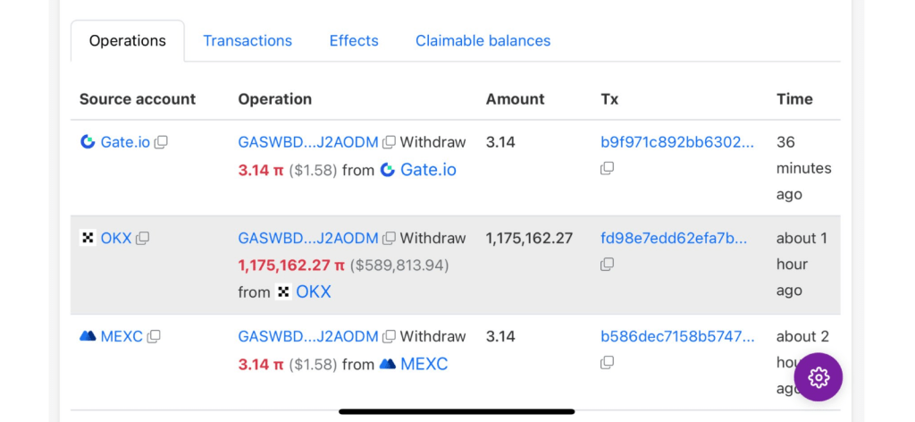 Based on reports, these sent-outs came from a single wallet—labeled GASWBD…—which also withdrew over 10 million Pi in just six days. That same address links to about 320 million Pi in earlier activity, leading many to wonder if a big miner, an institutional backer, or someone from the Pi team is behind it.