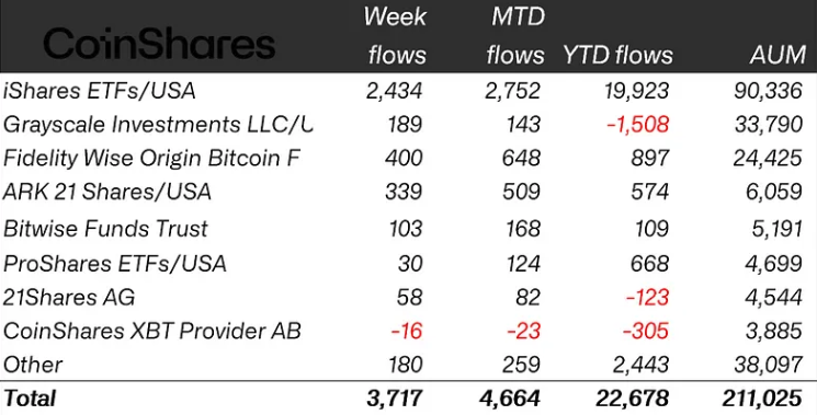 Global crypto exchange-traded products (ETPs) recorded $3.7 billion of inflows for the trading week ending Friday, CoinShares reported on Monday.