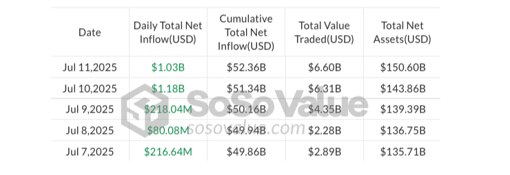 Still, ETP sentiment only surged further as daily inflows in Bitcoin exchange-traded funds (ETFs) jumped above $1 billion the next day, after BTC printed new all-time highs above $112,000 last Wednesday, according to SoSoValue data.