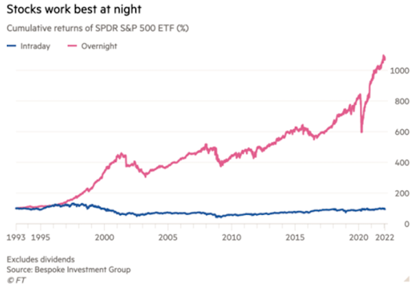 Fixed trading hours spawn strange distortions. Case in point: the “night effect.” This strategy involves buying US stocks at the market close (4:00 pm New York time) and selling them when the market opens (9:30 am). Over the past 30 years, this simple move would have delivered a staggering 1,100% return.