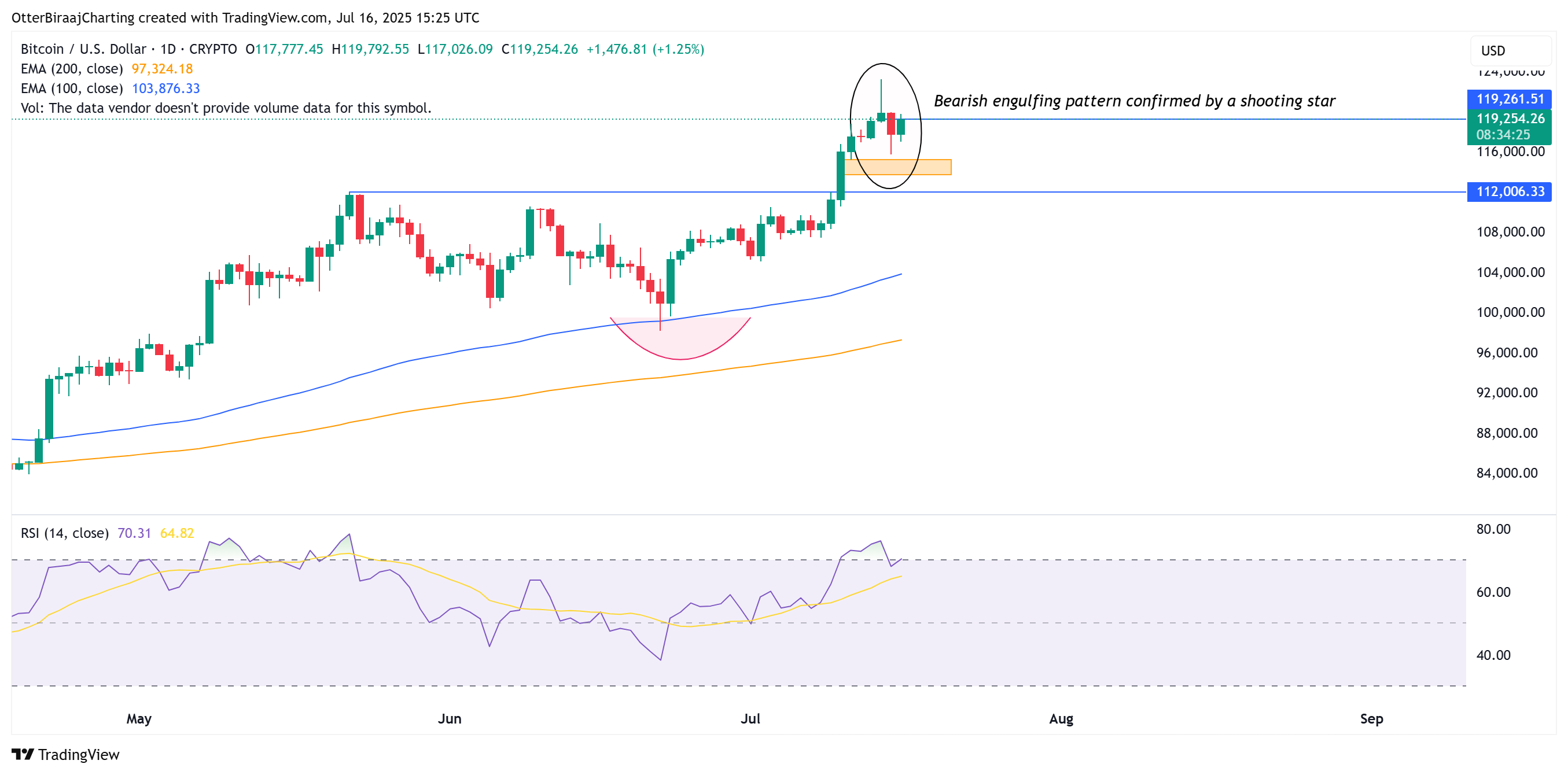 While the recent bearish engulfing pattern may signal short-term exhaustion or a potential reversal, it does not yet invalidate the broader uptrend. As long as key support levels hold around $112,000, the probability of BTC resuming its upward momentum remains high.