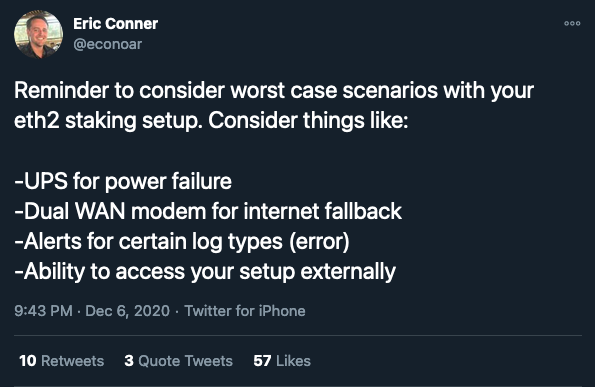 Finally, if something does happen to your node, don’t panic! Even during inactivity leaks, penalties are small on short time scales. Take a few moments to think through what happened and why. Then make a plan of action to fix the problem. Then take a deep breath before you proceed. An extra 5 minutes of penalties is preferable to being slashed because you did something ill-advised in a rush.