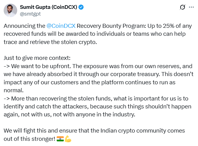 In an effort to recover the stolen funds, CoinDCX CEO Sumit Gupta announced a new recovery bounty program that offers white hat or ethical hackers up to 25% of any recovered funds that can help trace and retrieve them.