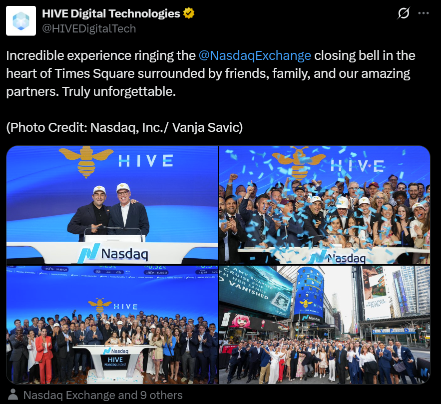 Following the company’s closing bell ceremony at Nasdaq, Hive shares posted a modest gain and have rebounded 31% over the past month. However, year-to-date, the stock remains down 27%, trading around $2.23 with a market capitalization of approximately $475 million.