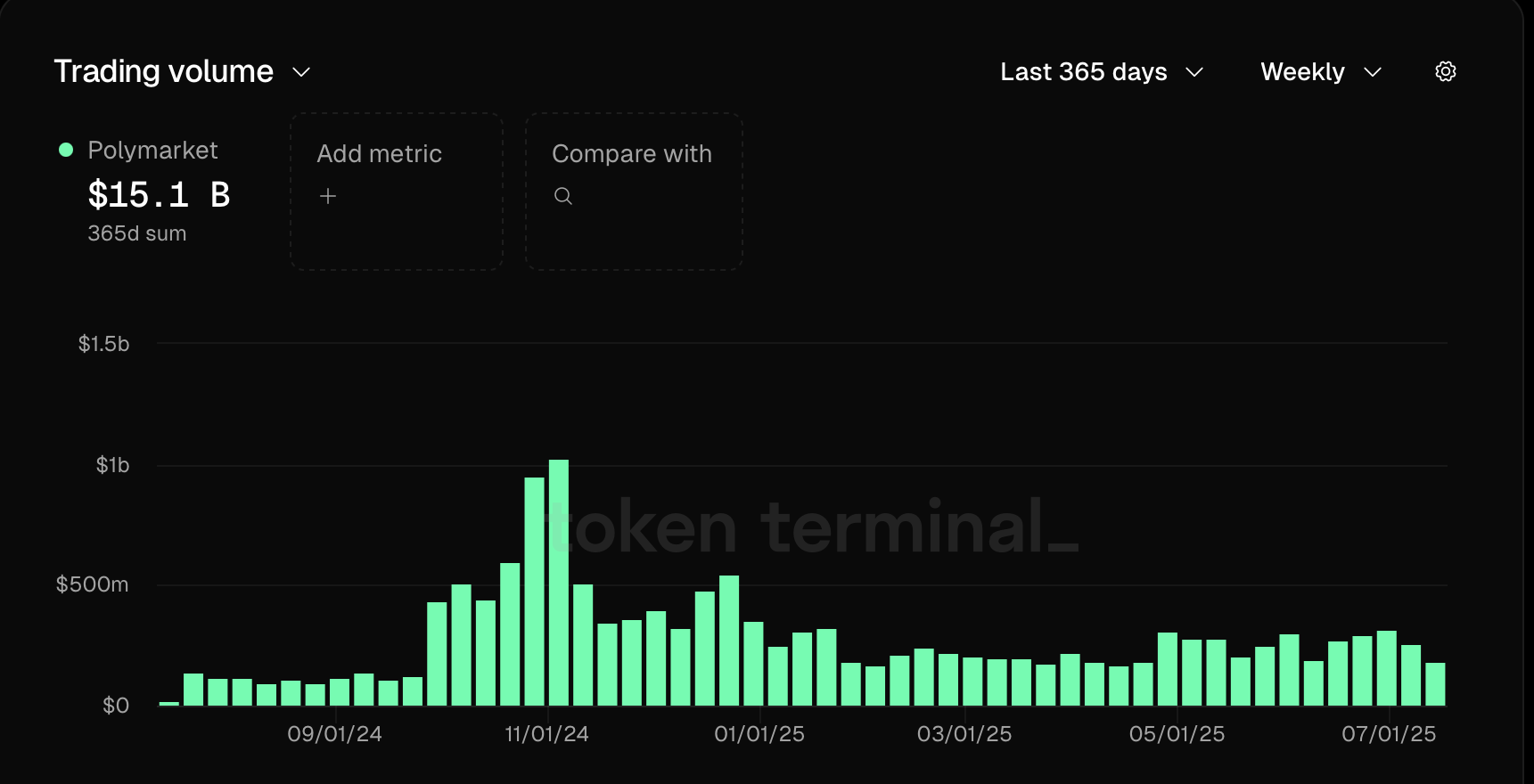 Polymarket is a decentralized prediction market platform that lets users trade on the outcomes of real-world events, such as election results and sports events. According to Token Terminal, trading volume on the prediction platform surpassed $15 billion over the past year.