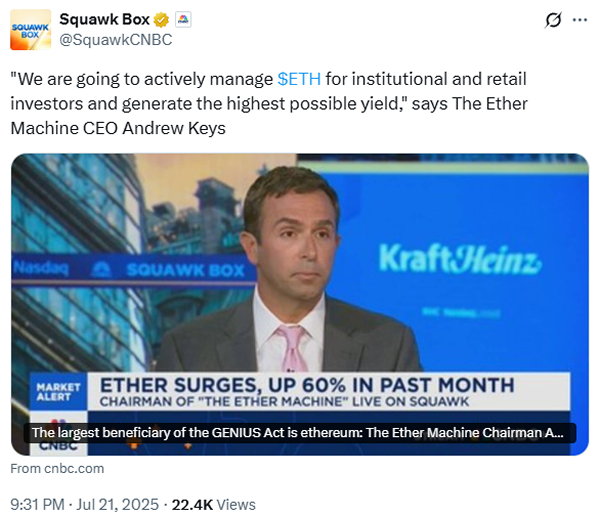 “The price of Ether per Bitcoin over the past decade has materially improved. Over the last decade, since Ethereum started, you would be 50x wealthier [had you owned it since then],” Keys said on CNBC’s Squawk Box on Monday while talking about his new Ethereum treasury firm, which plans to go public.