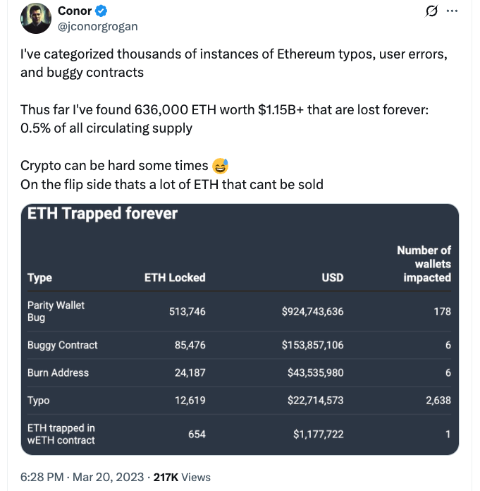 Grogan shared the estimate on X on Sunday, noting that the lost Ether (ETH) due to human error and bugs now accounts for more than $3.43 billion at current market prices.