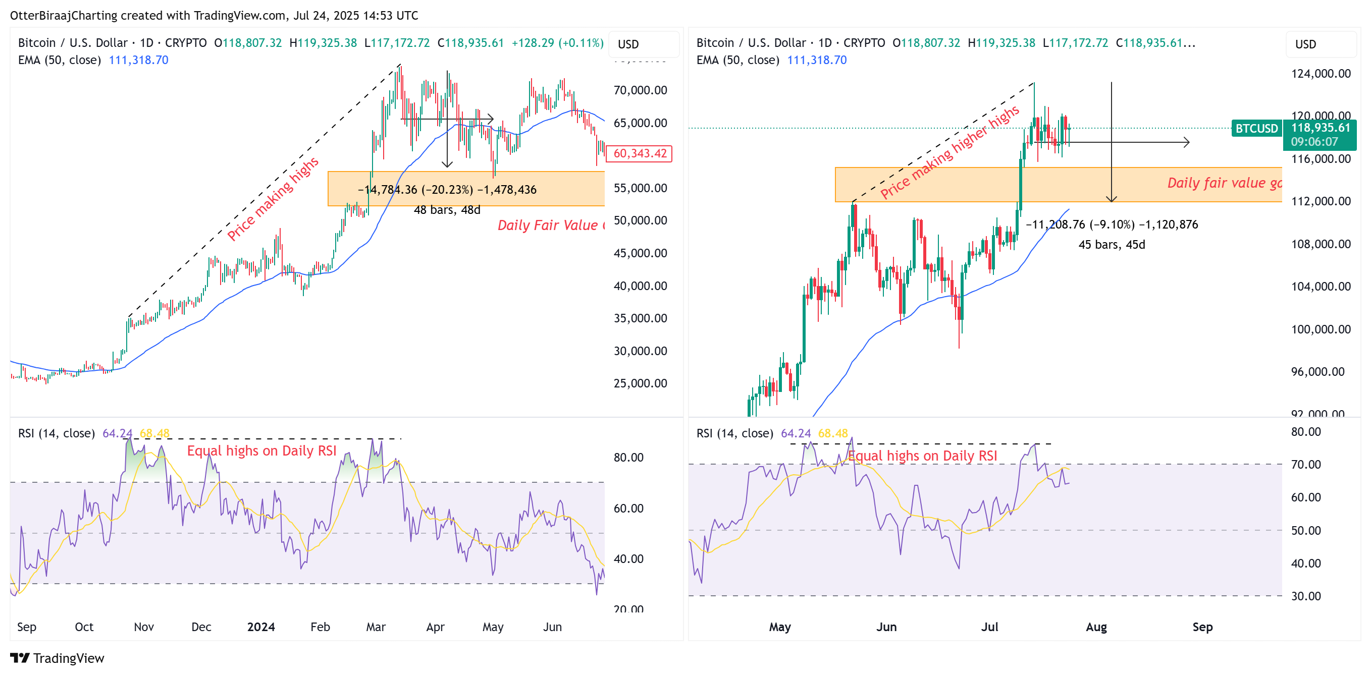 This same pattern appeared in March 2024, after which Bitcoin saw a 20% price drop in the following days. Likewise, the ongoing divergence may lead to another corrective move, potentially pushing Bitcoin to fresh short-term lows.