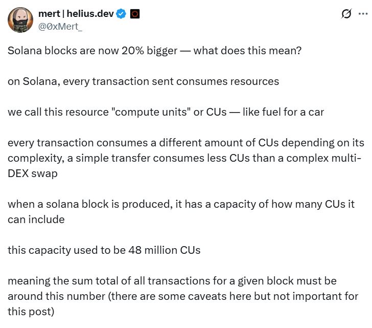 Mert Mumtaz, co-founder and CEO of Helius, which provides infrastructure and tooling for Solana developers, said in an X post on Wednesday that the upgrade means the Solana network can now fit more transactions per block.